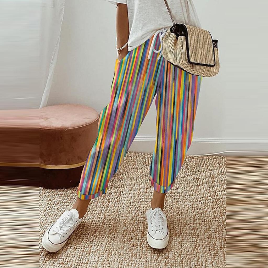 Women's Fashion Striped Print Loose-fitting Cotton-Linen Rolled-hem Casual Pants With Pockets