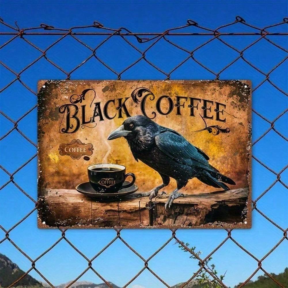 Vintage Metal Wall Art Decor Sign - Black Crow & Coffee 12x8 Inch Aluminum Plaque with Ornate Frame, Kitchen Bar Home Gothic Han