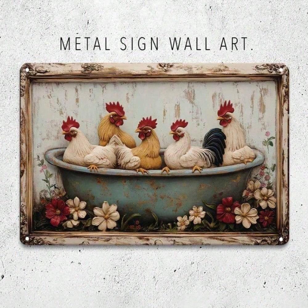 FLEUR Dekorativní cedule ve stylu farmy 8x12 palců Rustikální kovové nástěnné umění, Hliněná kuřecí dekorace do kuchyně koupelny domova kurníku, Vintage