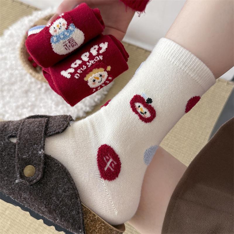 Woolen Socks for Women, Thick and Warm Mid-calf Socks for Autumn and Winter, Little Snowman Cartoon Versatile Long Socks