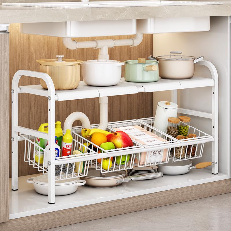 Retractable Under-Sink Tiered Shelf and Pot Storage Rack