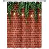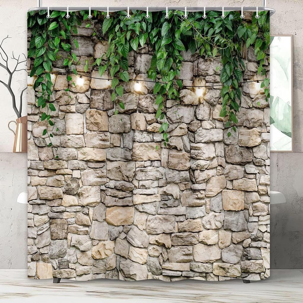 Stone Brick Wall Shower Curtain, Green Leaves Shower Curtain Set for Bathroom, Vintage 3D Vine with Lights Fabric Shower Curtain Restroom Bathtub