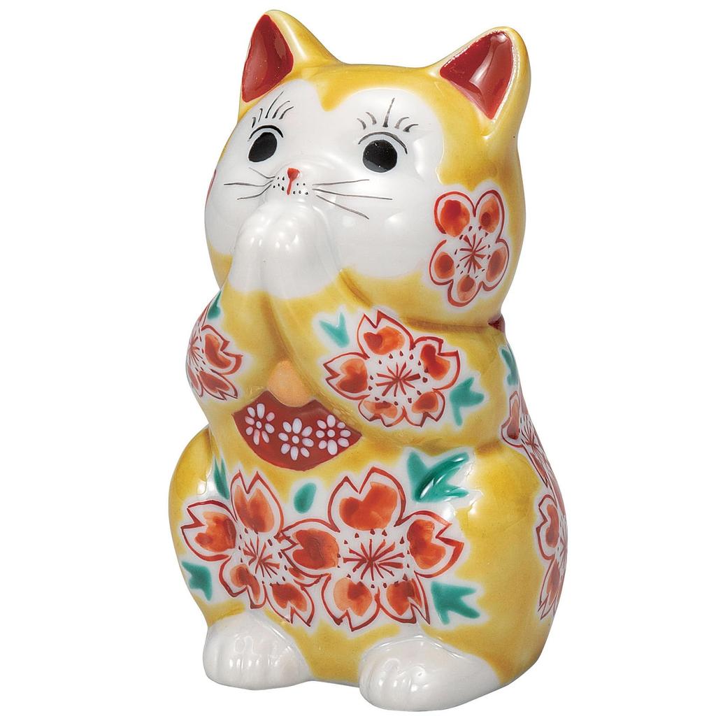 Kutani Ware Good Size Yellow Glazed with Cherry Maneki-neko Figurine, Luck, Fortune, Prayer, 9.5cm Tall, 3.2, Blossoms, K9-1596