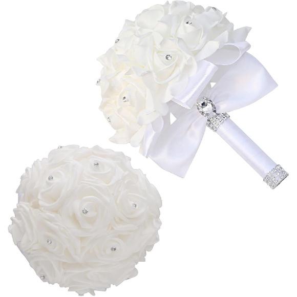 CUIWEI Wedding Bouquets for Bride & Bridesmaid - Hand Roses & Silk Roses Crystal Diamond Artificial Flowers for Wedding Parties, Churches (White)