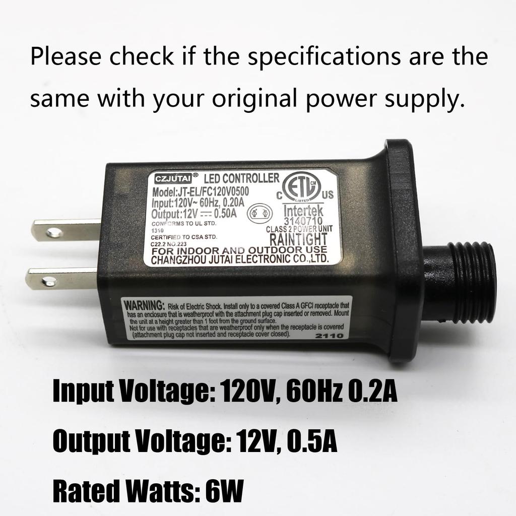 Model:JT-EL/FC120V0500. Input: 120V, 60HZ, Output: 12V, 0.5A, 6 Watts.This adaptor fits for 30V low voltage led device with current under 6 watts, such as Christmas String Lights, Copper Wire Light, Projector Light.