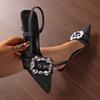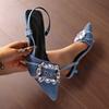 Dámské džínové podpatky široké šířky, špičaté lodičky na stiletto s přezkou z kamínků, společenské boty s páskem kolem kotníku pro ženy