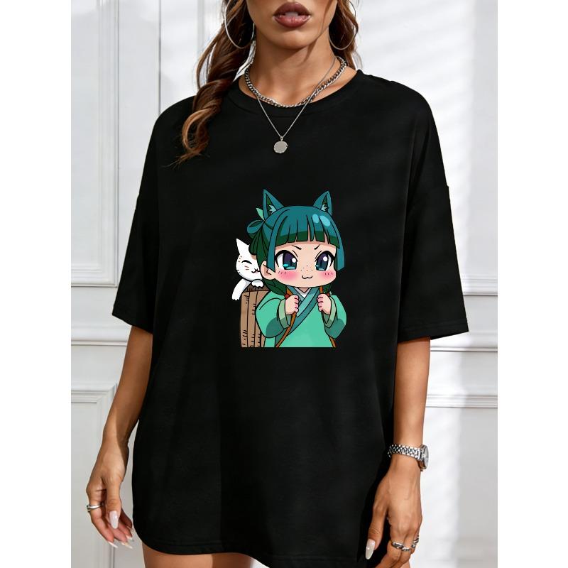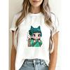 Roztomilá anime dívka s kočičím batohem Tričko Bílé s potiskem kreslené postavičky pro volný čas a každodenní nošení