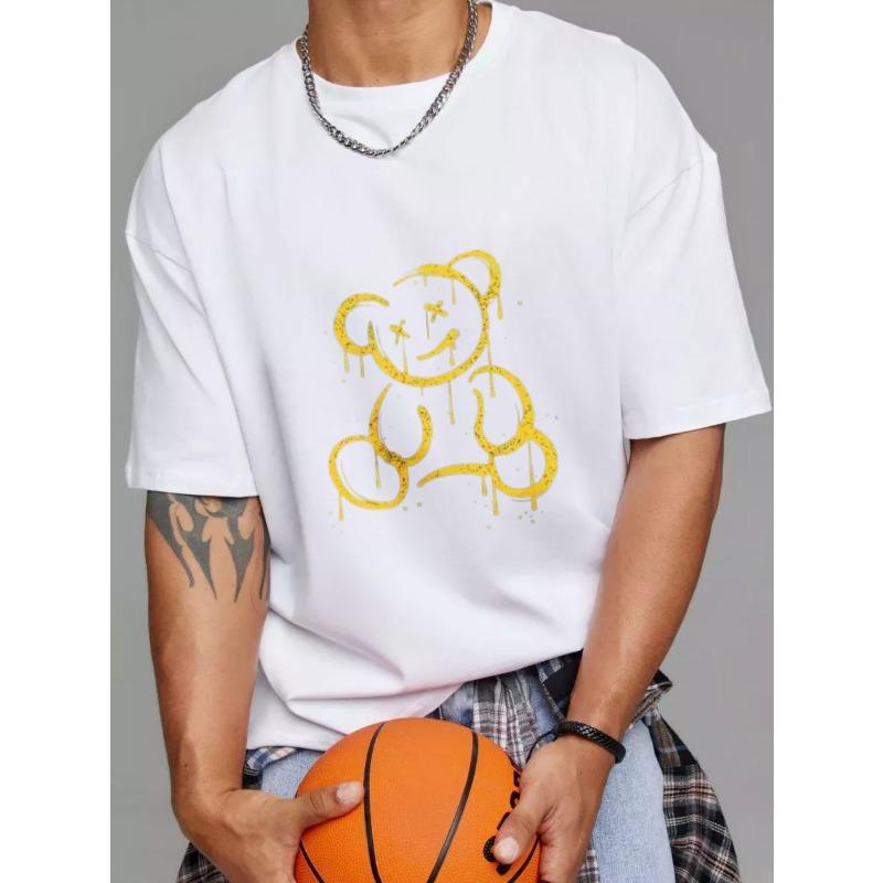 Bílé nadměrné tričko s žlutou kapající grafikou medvěda pro volnočasové nošení