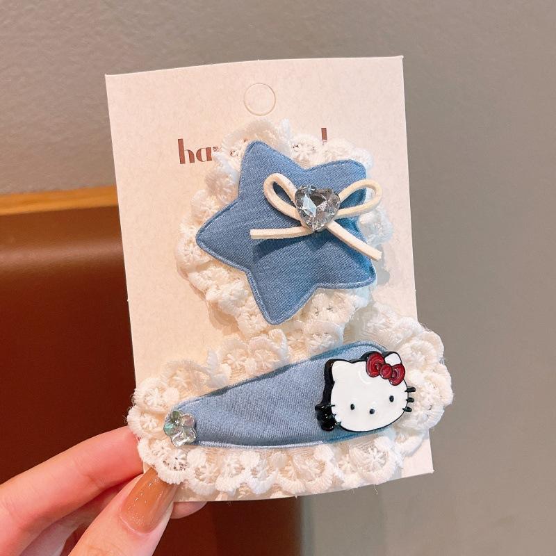 2Pcs Cartoon Sanrio Hello Kitty Hair Clip Cute Sweet Girls Headdress Set Denim Blue Bow Forehead Hairpin Kawaii Children Gifts
