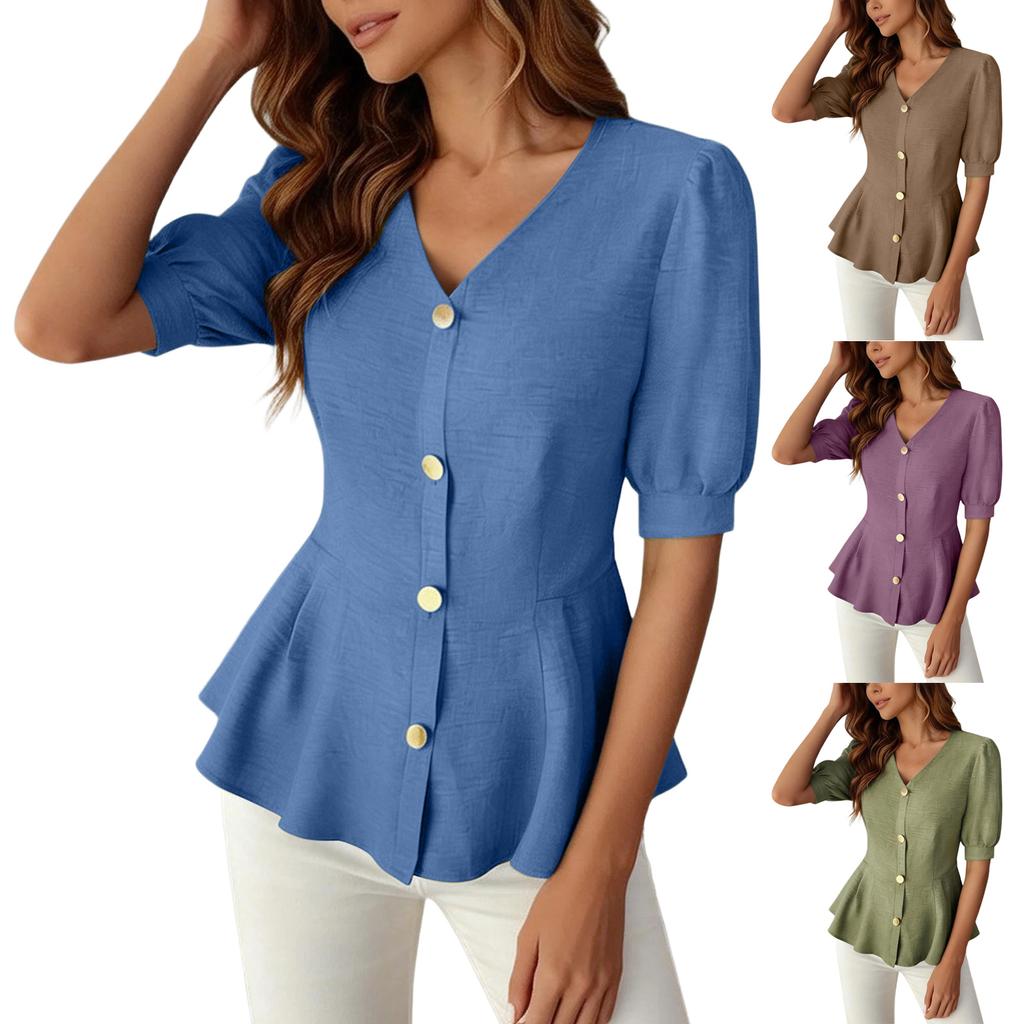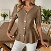 Dámský elegantní ležérní top s V-výstřihem a volánky, krátký rukáv