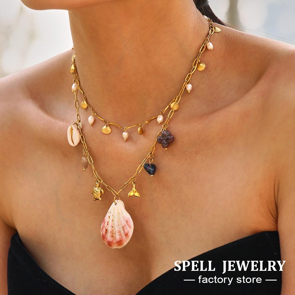 Multi Pendant Chain Necklace In Stainless Steel 18k Gold Plated With Seashell Charms Boho Seaside Holiday Necklaces For Women