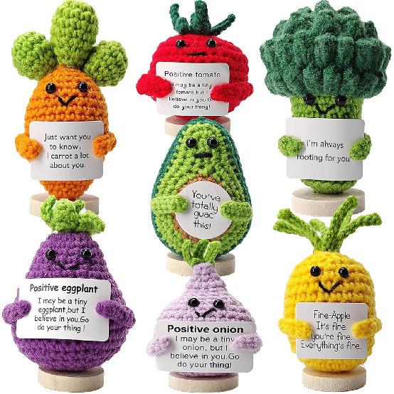 Charming Positive Crochet Collectibles: 7 piece crochet animals set, ultra cute and positive broccoli, fun and happy pineapple, sweet and comfortable eggplant, creamy and relax avocado, cheerful and motivate tomato, spicy and unique onion, orange and adorable carrot.These mini crochet animals can give you a positive reminder and strength of belief when you're feeling tough.