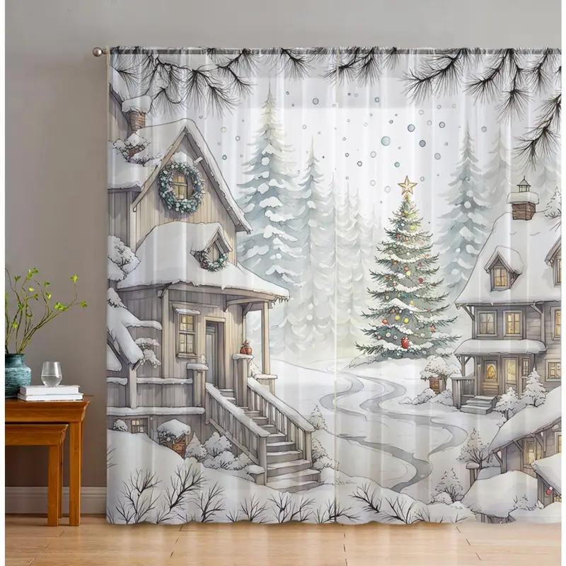 2pcs Christmas snow village sheer curtains with pole bag design, protecting privacy suitable for decoration in various scenes