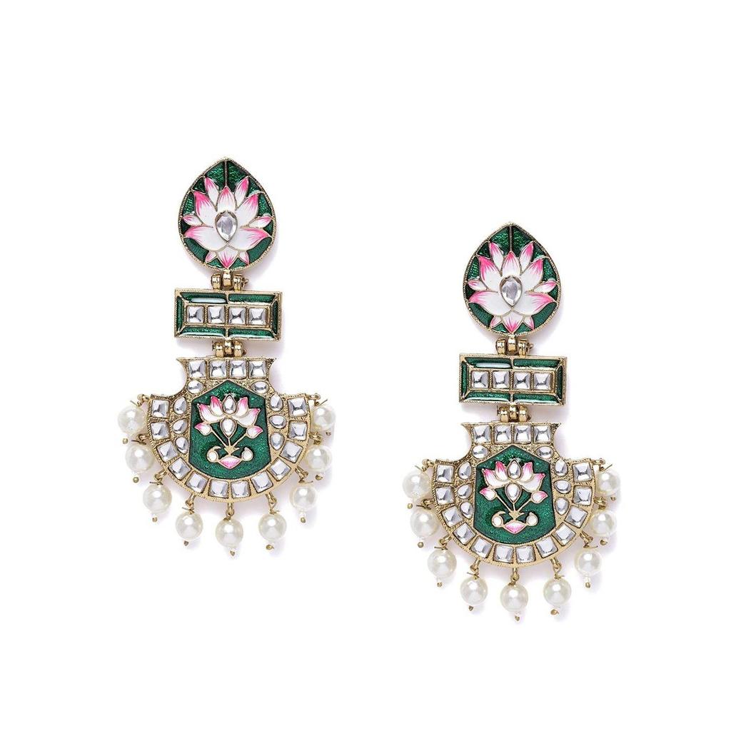 Green & Pink Meenakari Lotus Design Kundan Dangle Earring For Women