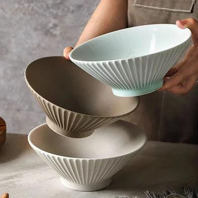 Domácí keramická mísa kreativní mísa na salát na vysoké noze japonský vertikální vzor klobouk miska jednobarevná mísa na zeleninu velká miska na rýži nádobí miska na nudle
