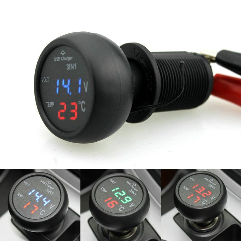 Universal 3-in-1 Car Voltmeter with USB Charger LED Digital Voltmeter Gauge Thermometer 12V/24V Cigarette Lighter Socket