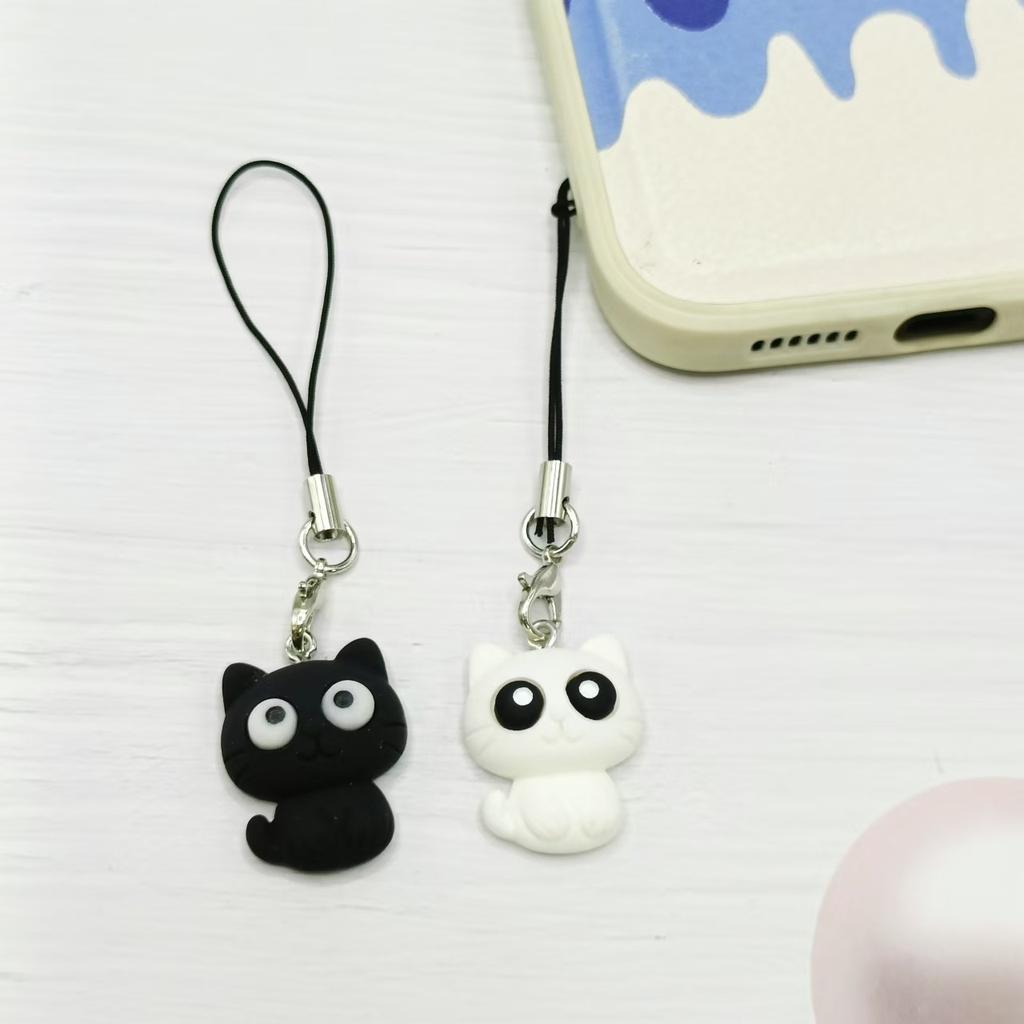 1 Roztomilý kočičí přívěsek na šňůrku k telefonu, Rozkošný černobílý design kočky, Vhodný pro pouzdra na telefony, Tašky a pouzdra na sluchátka