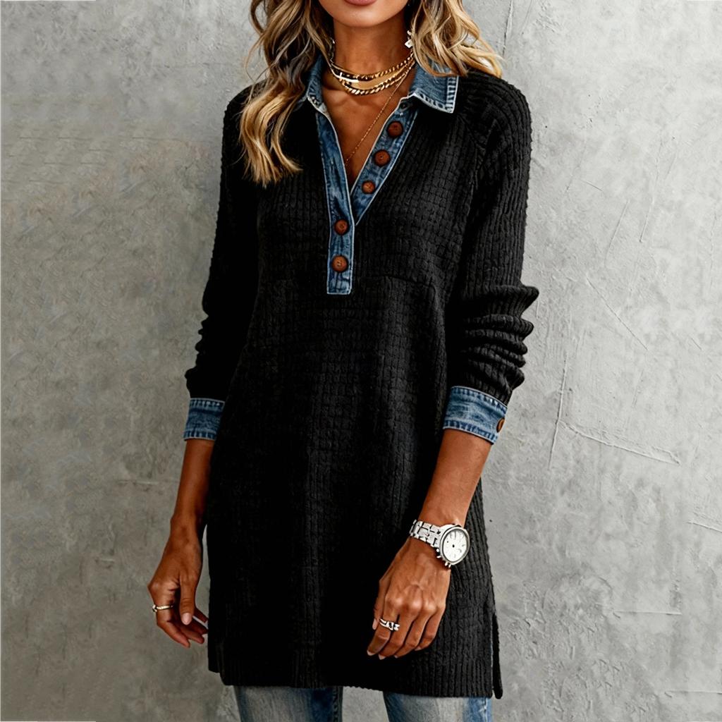 Women's Fashionable Casual Denim Patchwork Long,sleeved Collared Button Dress