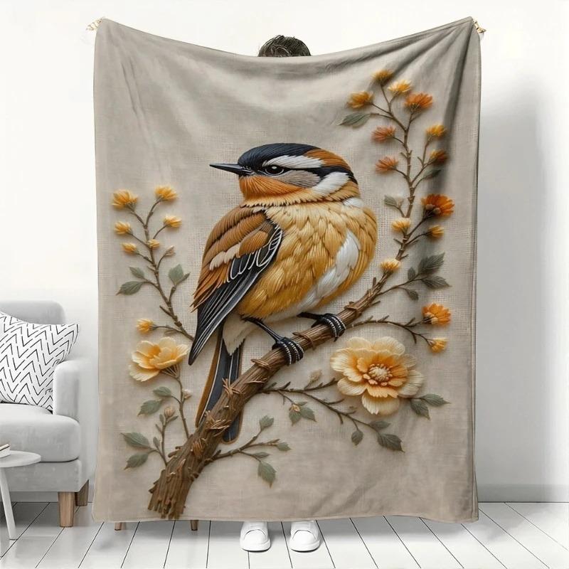 3D Embroidery Bird Blanket Realistic Sparrow Floral Branch Cozy Soft Throw Blankets for Sofa Bed Perfect Gift for Home Decor