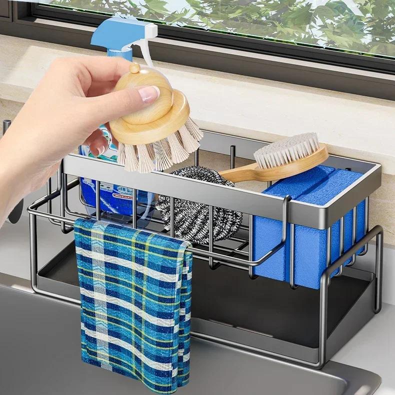 Kitchen Sink Storage Rack Multifunctional Storage Rack Carbon Steel Adjustable Drain Rack Sink Hanging Cloth Organization Shelf
