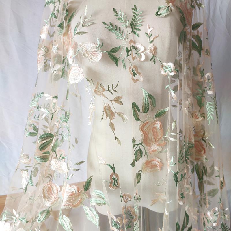 Soft Mesh Floral Embroidery Lace Fabric Colorful Rose Leaf Embroidered Fabric for DIY Sewing Clothes Wedding Dress Veils