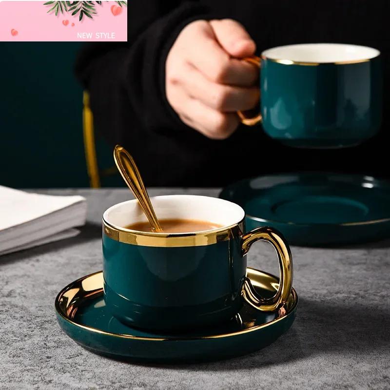 Keramický šálek na kávu Čajový šálek Podšálek Sada Zlatý okraj Zelený porcelán Šálek na kávu Mléčný šálek 200ml