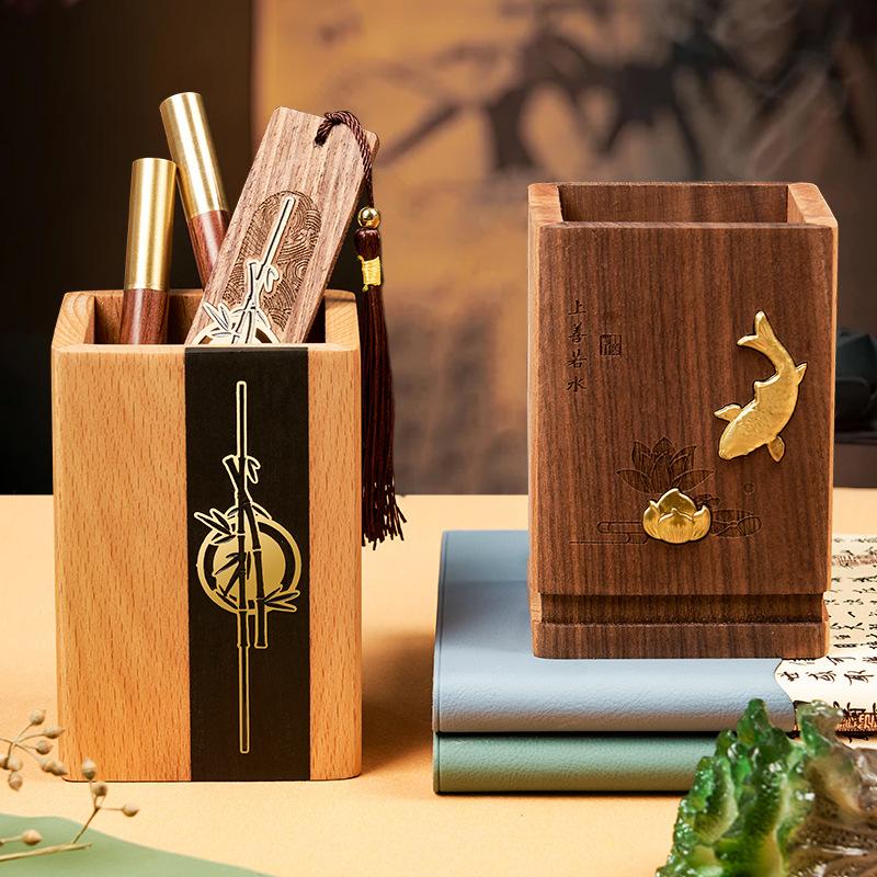 1pc Solid Wood Pen Holder Light Luxury Office Desk Storage Box Vintage National Style Home Office Ornaments Holiday Gifts