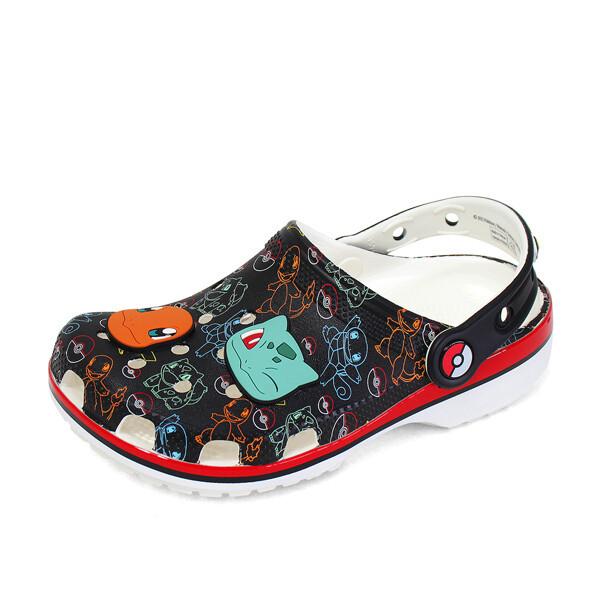 Introducing the Crocs Pokémon Print Kids Junior Clog Sandals in Black, model number 211344-90. These fun and vibrant sandals feature beloved Pokémon characters, making them an instant favorite among children. Crafted from high-quality materials, they ensure comfort and breathability, perfect for active kids during warm days.