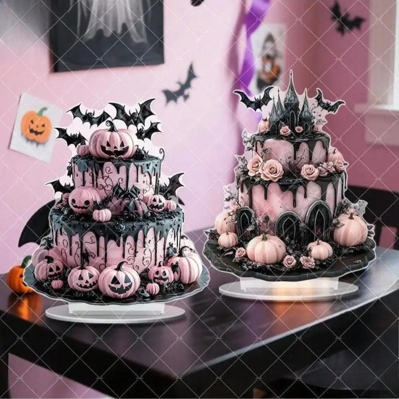 1pcs Halloween Creepy Pink Cake Castle Horror Pumpkin and Bat Tabletop Decoration Ornament - 2D Flat Acrylic Desktop Ornament