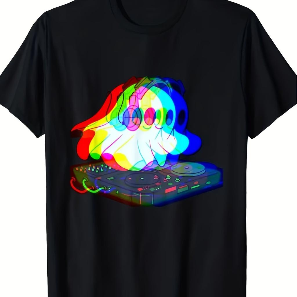 Ghost DJ Trippy Glitch Effect Graphic Tee Men's Casual Short Sleeve Cotton T-Shirt Music Festival Outfit Party