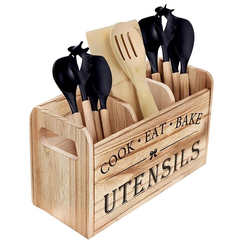 Stojan na kuchyňské náčiní se třemi přihrádkami, rustikální dřevěný úložný box, vintage stolní nádobí, farmářská skříňka na nádobí