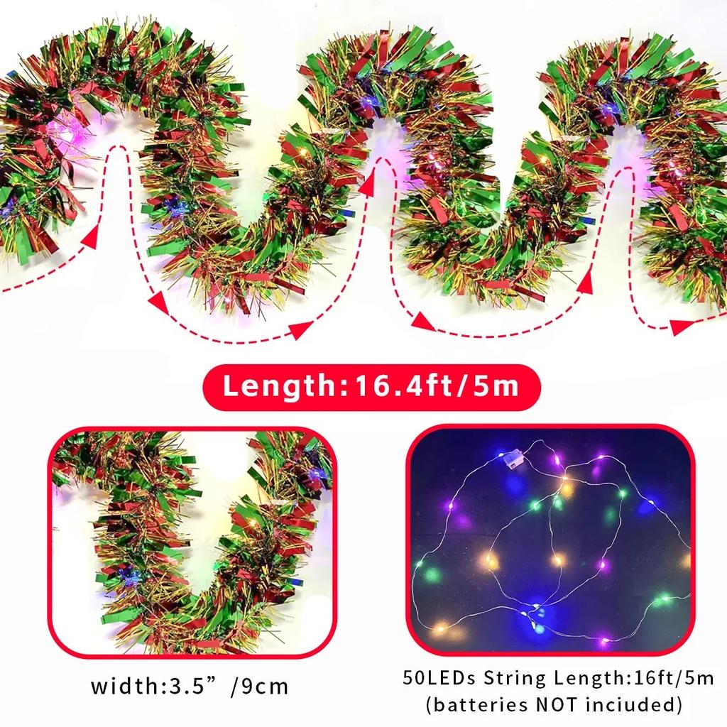 1pc 16 Ft Christmas Tinsel Garland Metallic Shinny with LED Lights Tree Thick Hanging Decorations for Xmas Party Indoor