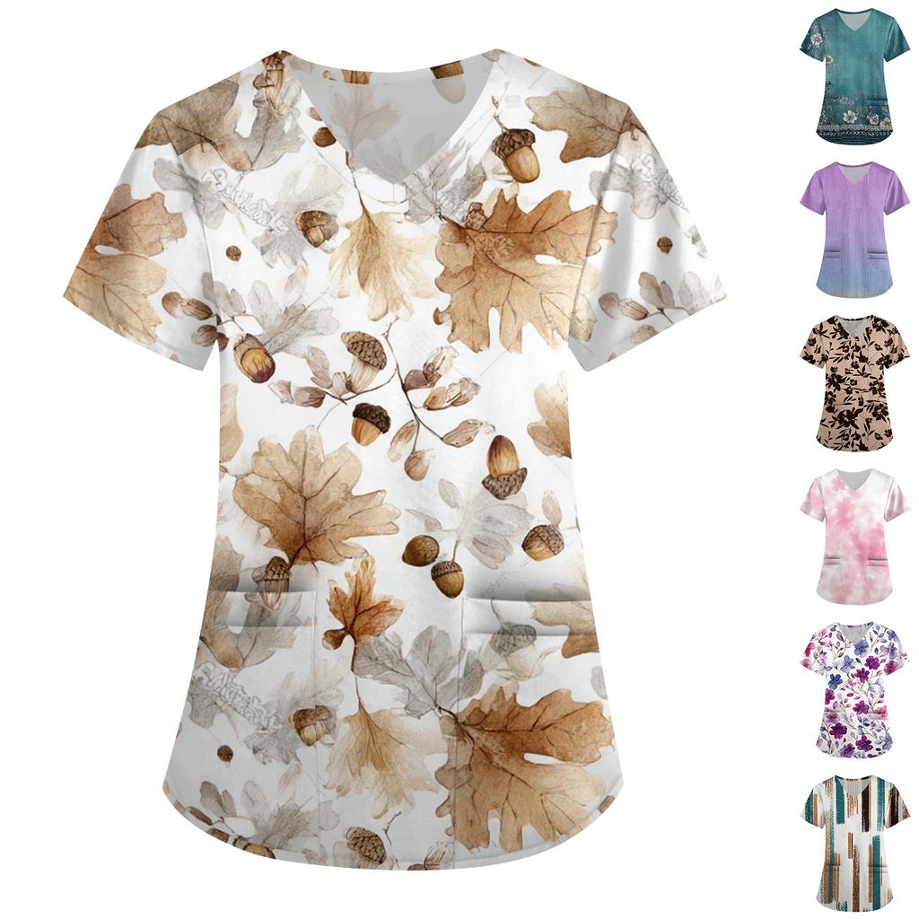 Plus SizePrinted Scrub Working Uniform Tops For Women's Cross V-Neck Print Short Sleeve Fun T-Shirts Workwear Tee With Pockets