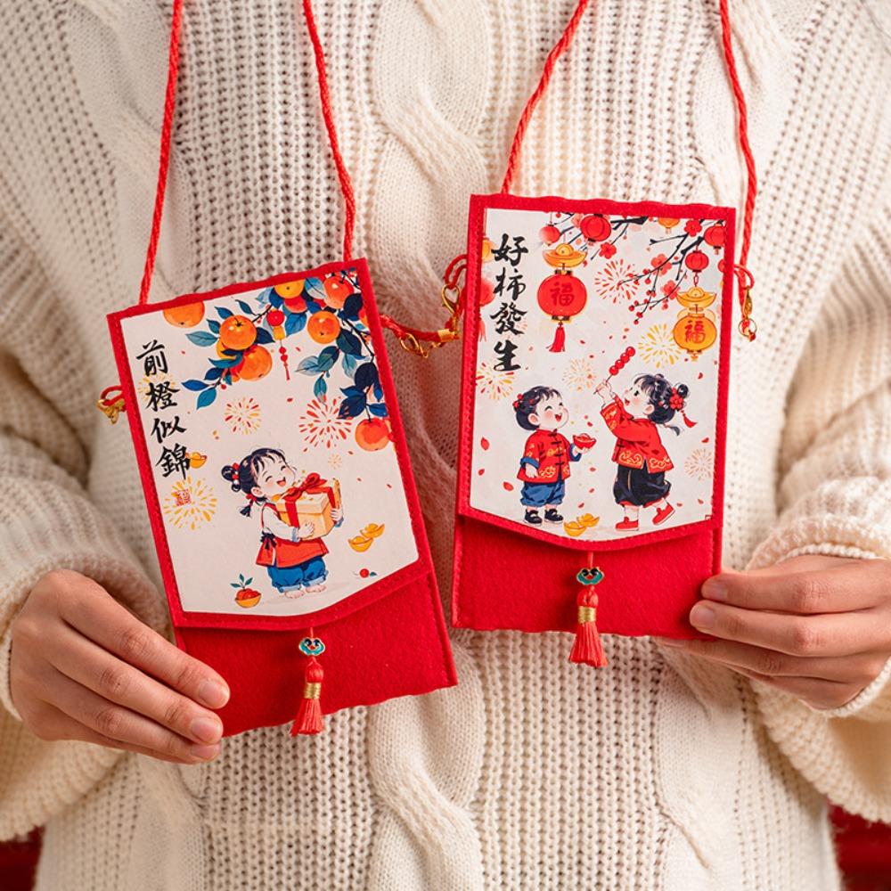 Traditional Spring Festival Cloth Red Envelopes Chinese Style Rectangular New Year's Blessing Bag Reusable Cartoon Pattern
