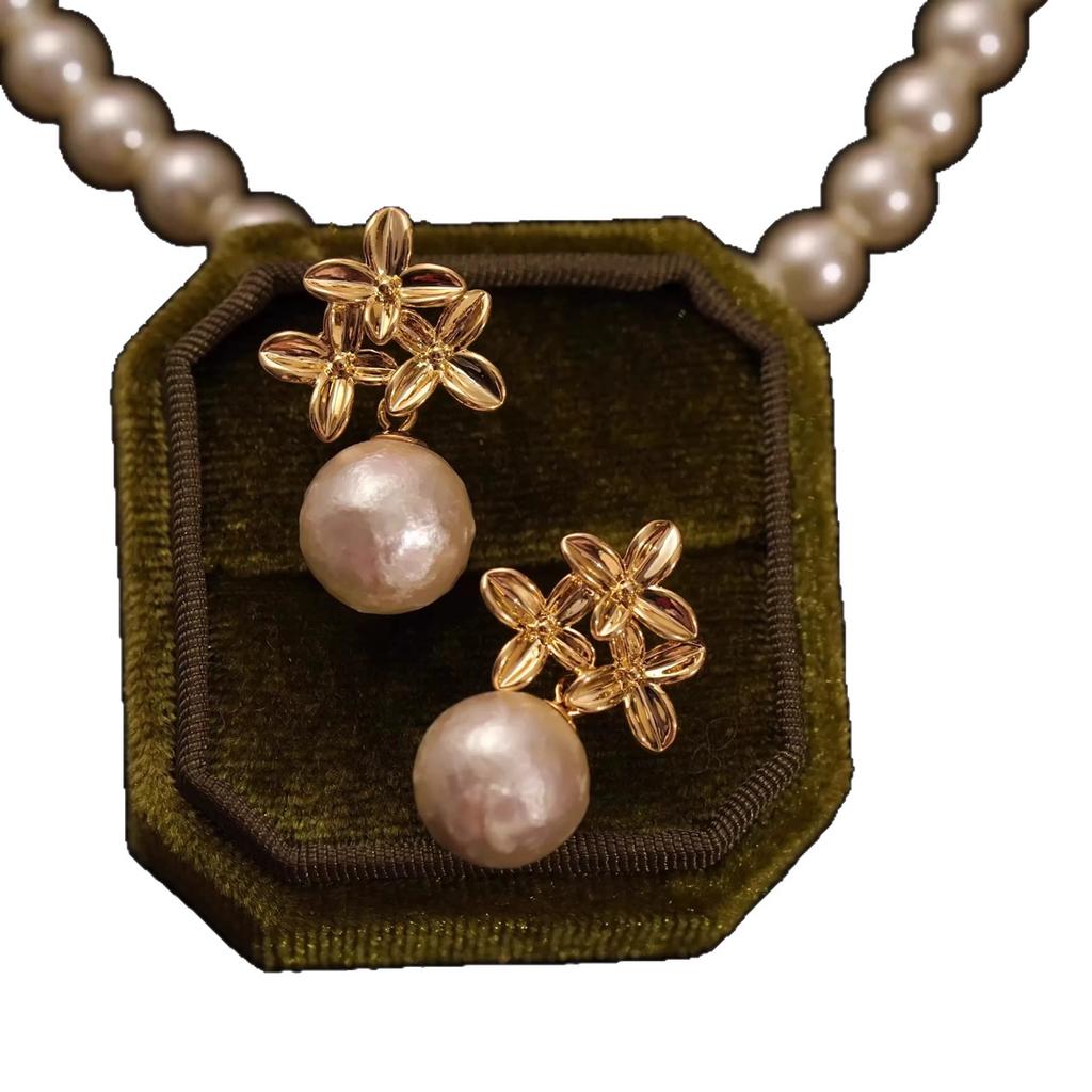 Golden flower French elegance temperament niche design sense natural freshwater Edison wrinkled pearl stud earrings