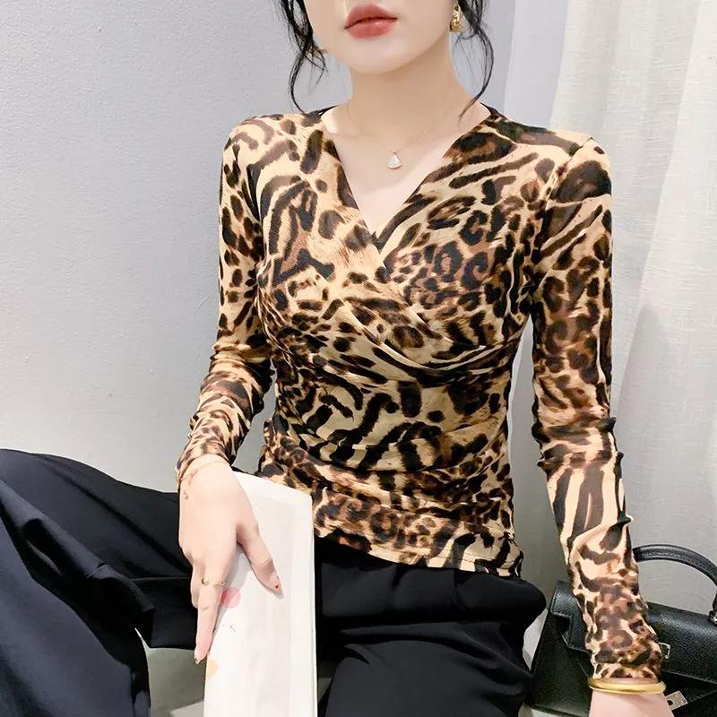 Women's Leopard Print V-Neck Long-Sleeve Sheer Slim Fit Blouse Casual Top