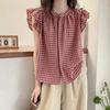 Black White Plaid Ruffled Sleeveless Blouse Round Neck Shirt Casual Daily Top For Women