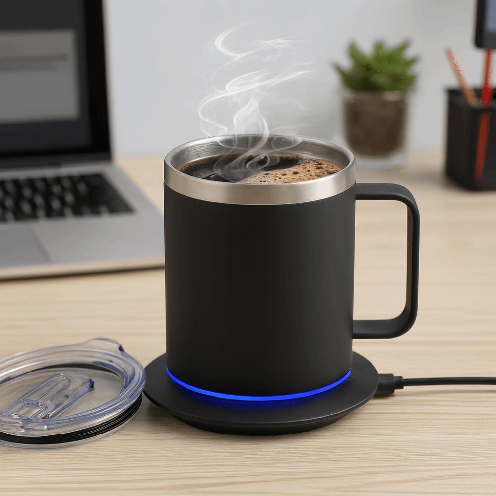 Inteligentní samohřející hrnek na kávu napájený přes USB Dvouvrstvý automaticky hřející hrnek na kávu z nerezové oceli s víčkem