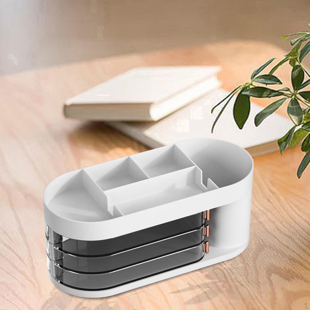 - Multifunkční: Design s přihrádkami, se 3 otočnými zásuvkami, velká kapacita, pomůže vám uspořádat kancelářské potřeby, jako jsou pera, pravítka, fixy, sponky, jmenovky, skvělý také jako organizér na kosmetiku, pro uložení štětců na make-up, tekutých produktů a dalších malých osobních věcí.