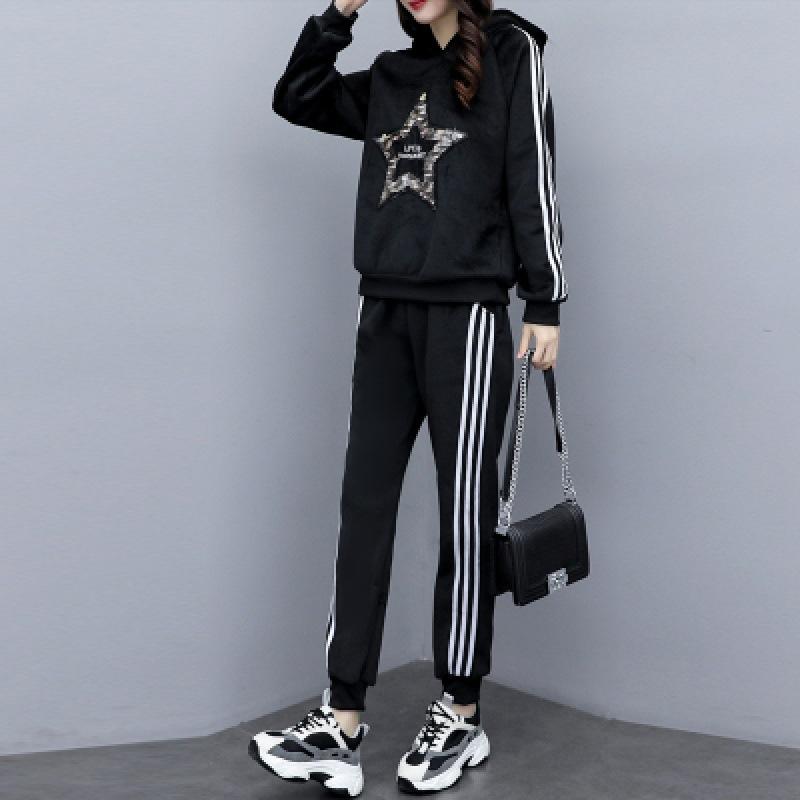 Gold Velvet Set - Women's Autumn/Winter Large Size - Slimming and Concealing Fat - Casual Hooded Trendy Two-Piece Set