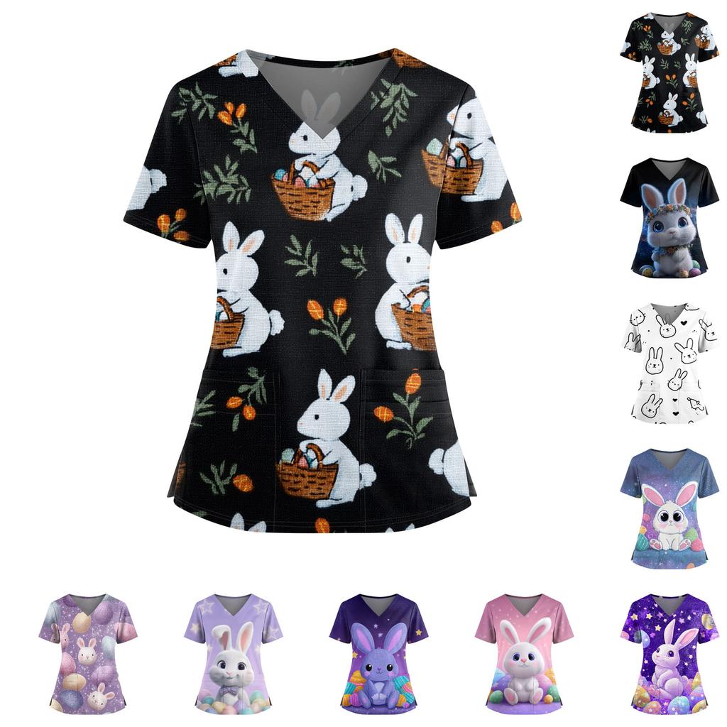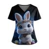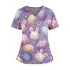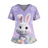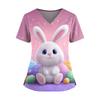 Women's Easter Print V-Neck Double Pocket Short Sleeve Uniform Top With Slit Hem