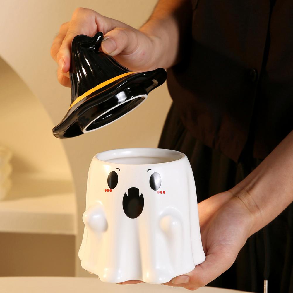 Ghost Pattern Ceramic Cup with Elf Hat Lid Halloween Theme Handmade Artwork Mug Halloween Themed Elf Decor Mug Ceramic Drinkware