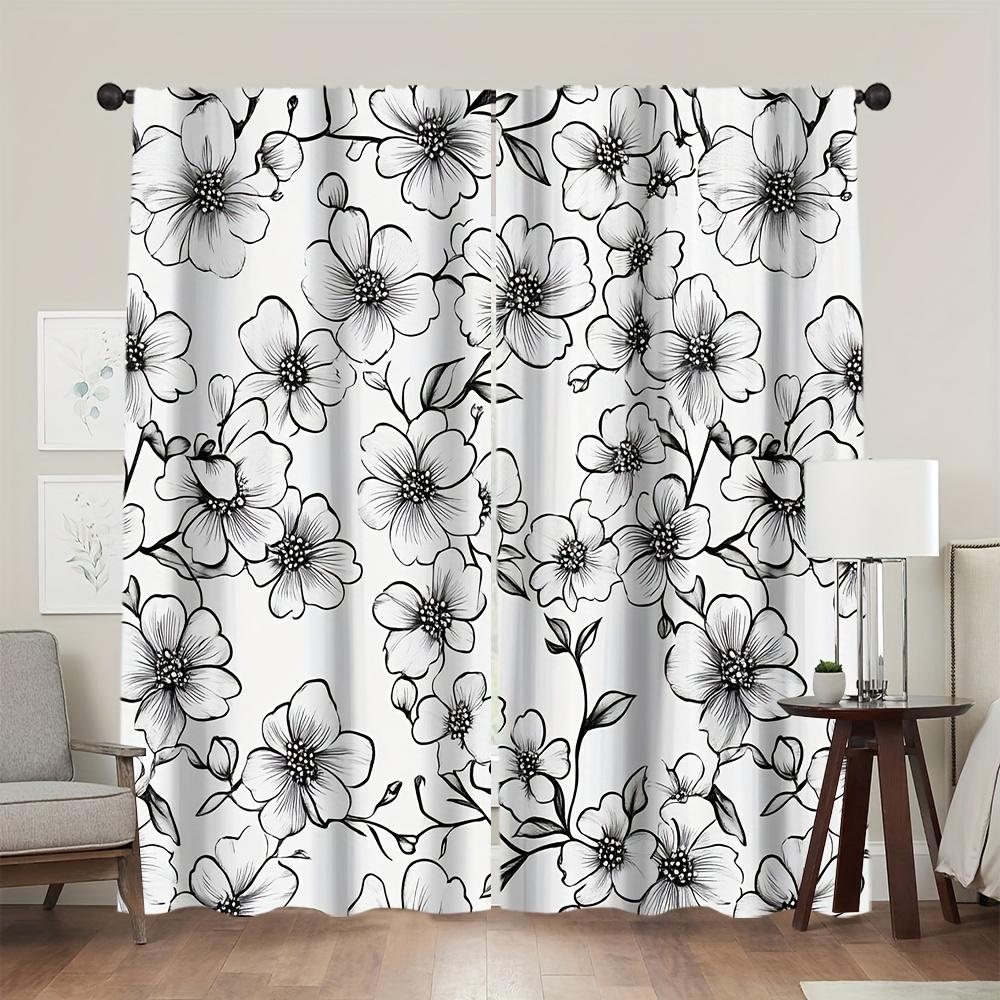 2 Pieces Black and White Floral Print Curtains Polyester Fabric Suitable for Bedroom Living Room Decoration