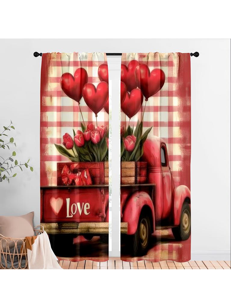 2pcs Rustic Red Truck & Love Heart Curtains Perfect for Valentine's Day Window Decor Rod Pocket Curtains