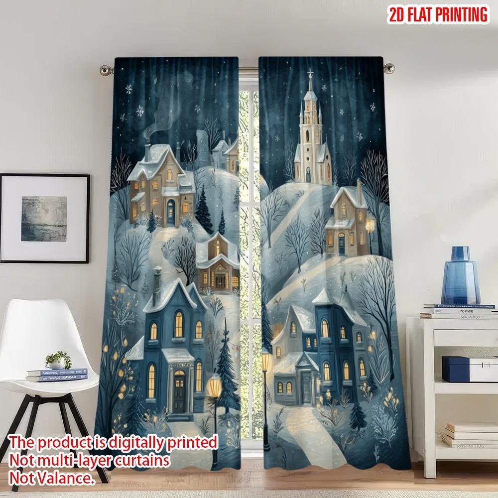 2pcs 2D flat printing Christmas Hot Party Curtains Cozy Winter Village Snow Scene Digital Printed Polyester Drapes Birthday