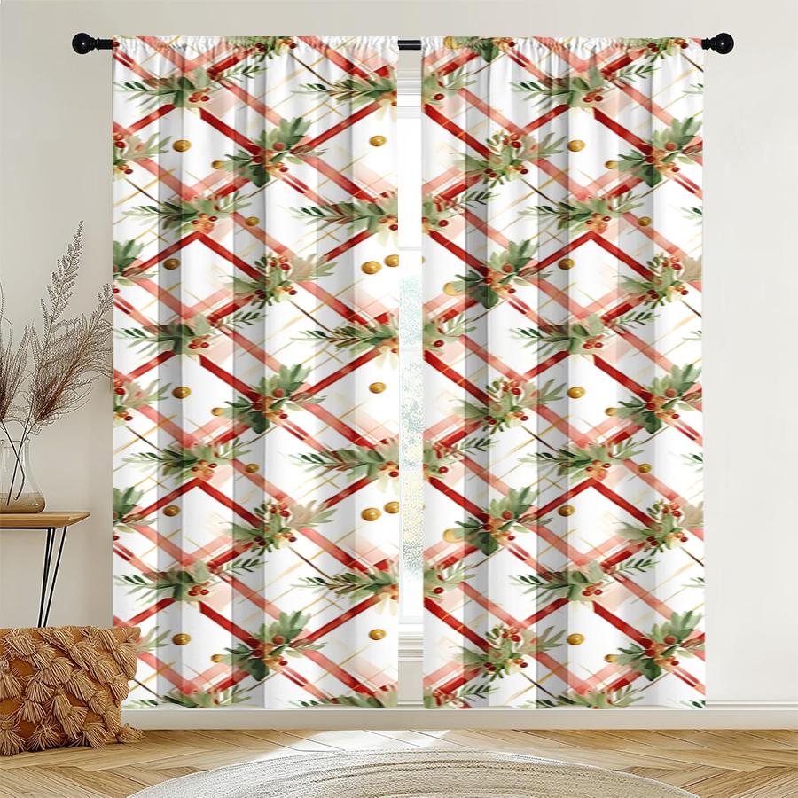 2pcs Watercolor Christmas Plaid Curtains Holly Berry Design for Holiday Window Decor Home Accent Rod Pocket.