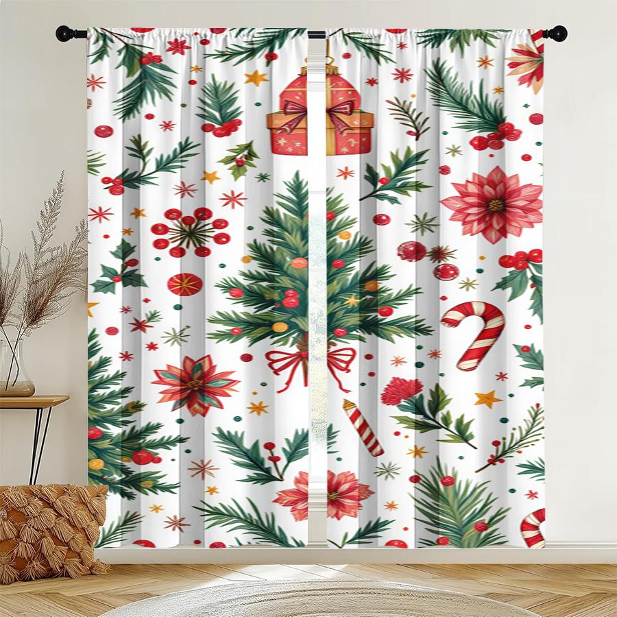 2pcs Festive Christmas Pattern Curtain Polyester Holiday Window Decor Winter Berry Gold Curtains Home Decor Rod Pocket Curtains.
