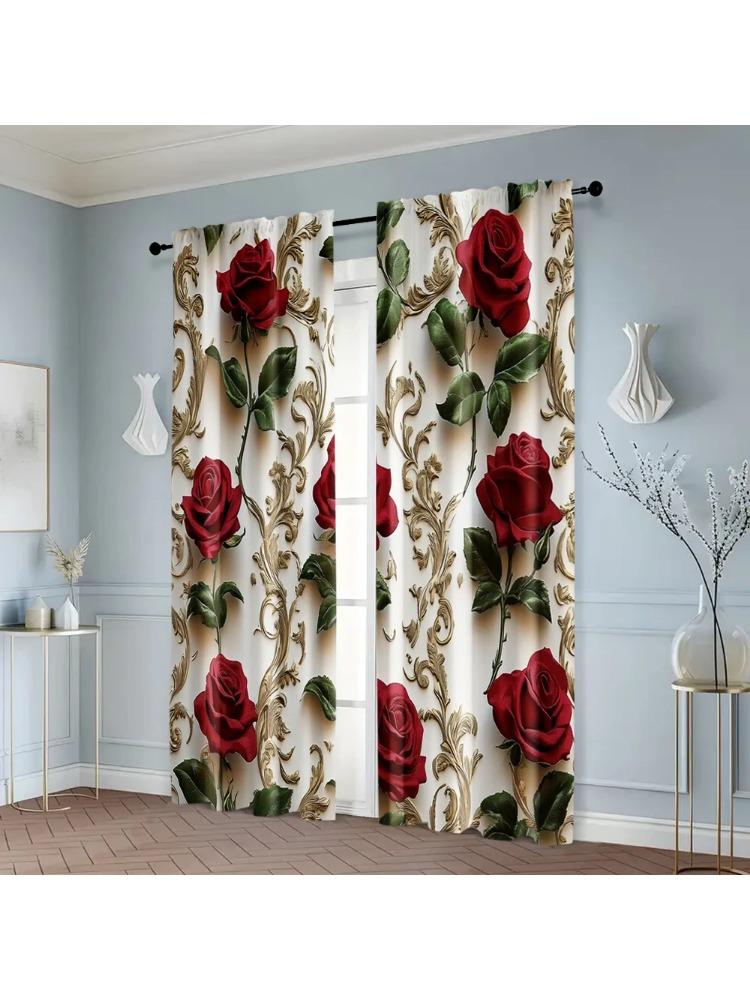 2 ks Luxusní závěsy s potiskem červených růží a zlatým květinovým vzorem Polyesterová tkanina (bez tyče) Všechna roční období pro ložnici a