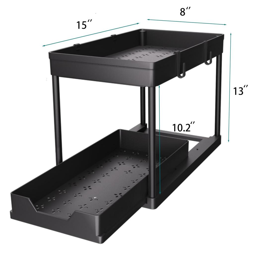 2 Tier Under Sliding Cabinet Basket Organizer Drawer with 4 Hooks, Multi-Purpose Under Sink Storage for Bathroom Kitchen Desktop