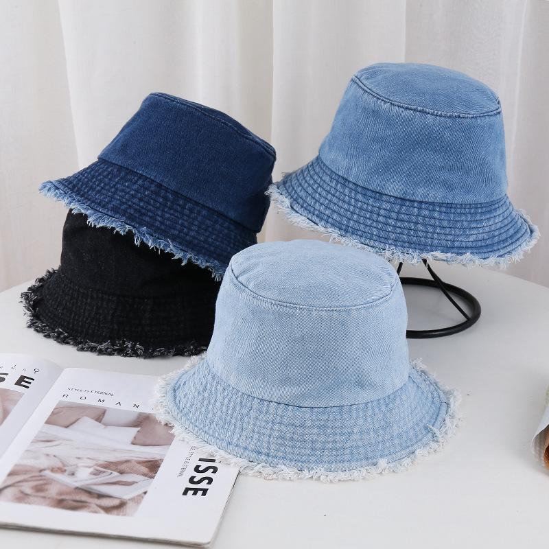 Spring and summer old retro versatile face covering solid color rough edge denim bucket hat woman